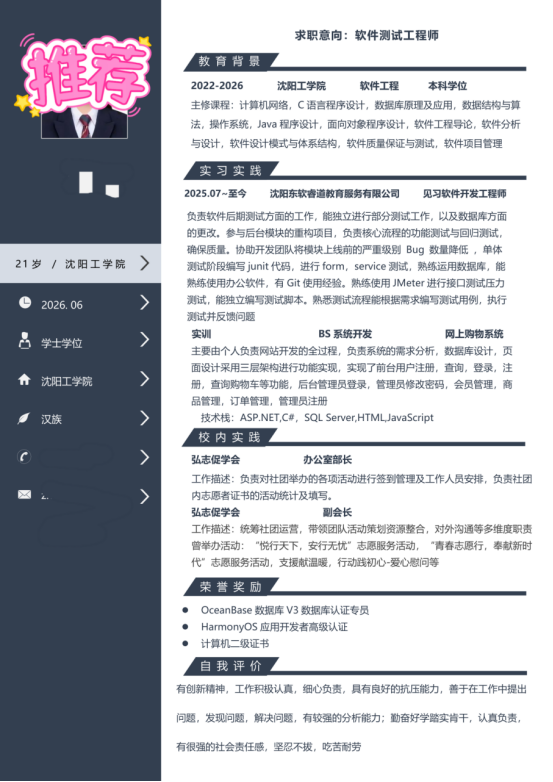 基本信息:女,21 岁,沈阳工学院 2026 届本科,软件工程专业