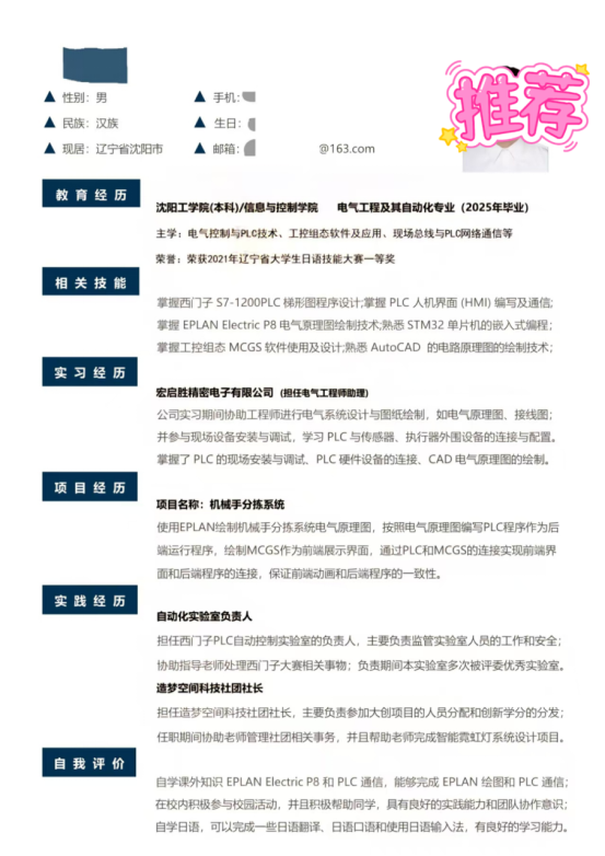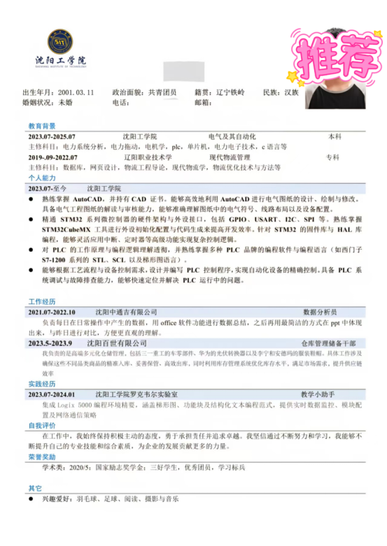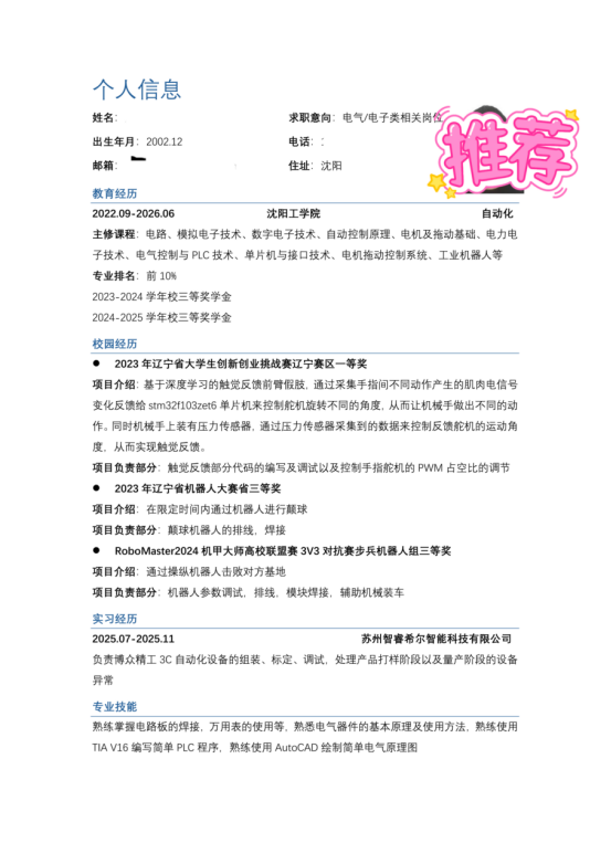 基本信息:男,2002 年 12 月生,沈阳工学院 2026 届本科,自动化专业,专业排名前 10%