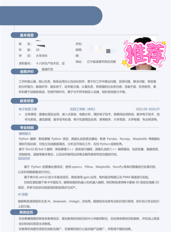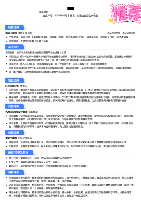 基本信息:男,2003 年 04 月生,内蒙古自治区宁城县人,沈阳工学院 2026 届本科,通信工程专业