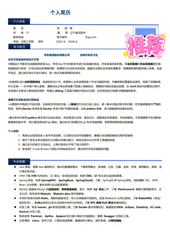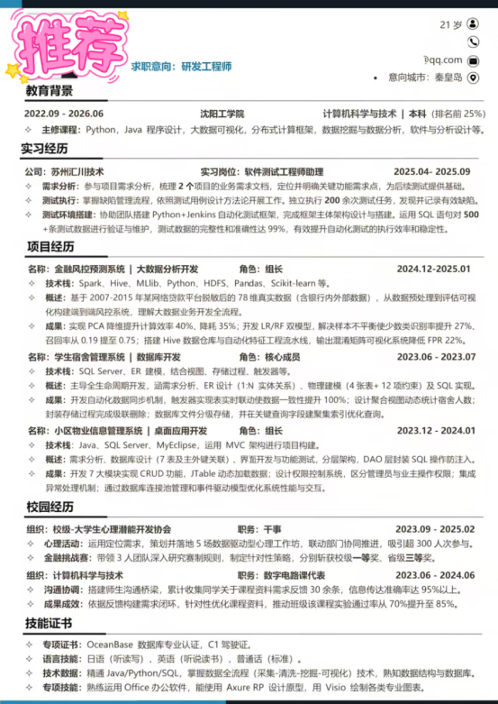 基本信息:男,21岁,沈阳工学院2026届本科,专业排名前25%