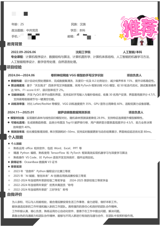 基本信息:女,25 岁,中共党员,沈阳工学院 2026 届本科,人工智能专业