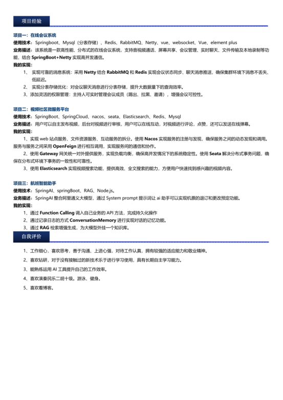 项目经验:在线会议系统、视频社区微服务平台、航班智能助手(SpringAI+RAG)