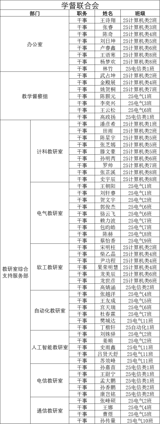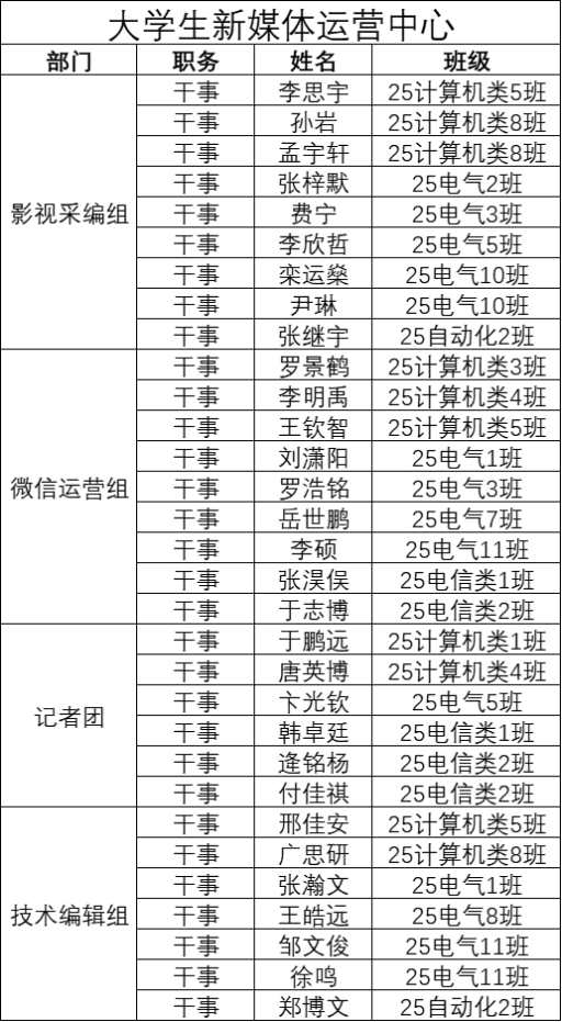 经个人自主申报,“信息与控制学院团委招新面试”公开竞选演讲、学院综合考查、报送信息与控制学院团委讨论通过,现将信息与控制学院2025年团委学生会、大学生新媒体运营中心、学督联合会招新面试结果公示如下: