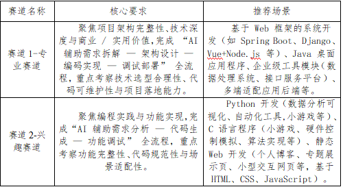 本次大赛以“AI 赋能・编程创想”为核心,要求大家结合真实需求场景,全程用AI工具完成编程项目开发。为兼顾不同基础、不同需求的同学,我们设置两个赛道,大家可按需选择: