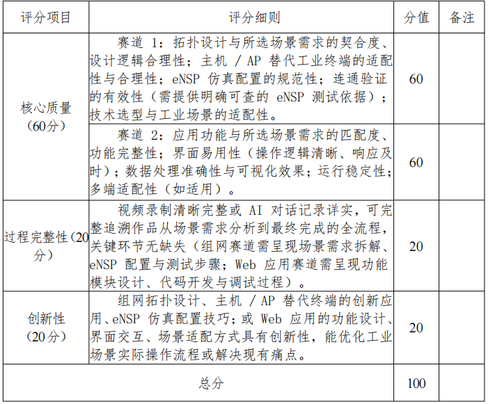 赛道一重点核查 eNSP 工程文件可用性、主机 / AP 替代合理性及连通有效性;赛道二重点测试功能完整性与场景适配性,具体评审标准如下: